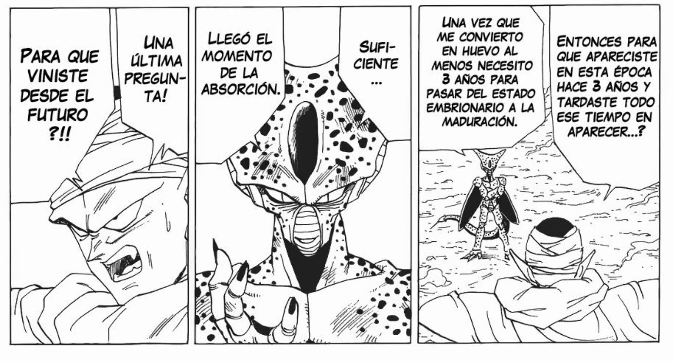 Trunks al revisar los controles de la gastada maquina notó que la misma había llegado un año antes de su primer arribo a esa época, ósea cuatro años antes. Luego Piccolo se encuentra con Cell en el pueblo de Ginger y le hace confesar su origen. El bioandroide le explica que viajo al pasado en búsqueda de su estado perfecto y que paso tres años como larvario hasta llegar a su forma base.