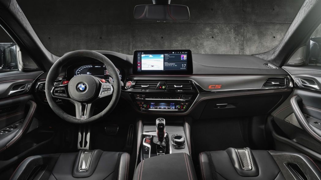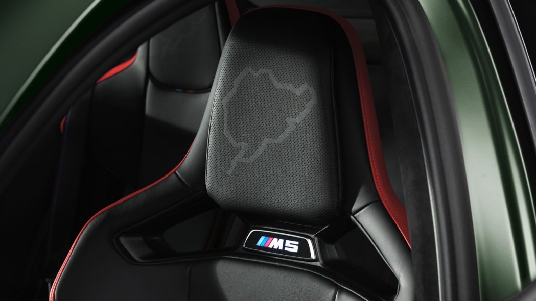 Por dentro, el BMW M5 CS tiene espacio solamente para cuatro pasajeros, con asientos M Sport de carbono al frente y también de tipo butaca, aunque más simples y sin ajuste eléctrico o calefacción, en la parte trasera. Los reposa cabezas tienen bordado el mapa del Nürburgring y la placa de las puertas tiene el logo CS.