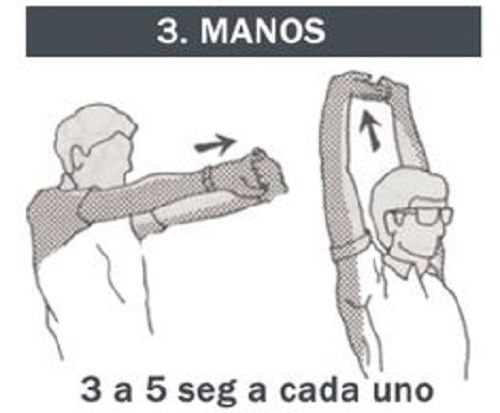 Entrelazar las manos en la espalda y estirar lo máximo posible. Empujar levemente hacia abajo, manteniendo la espalda recta. Esperar cinco segundos y relajar. Se debe repetir tres veces.