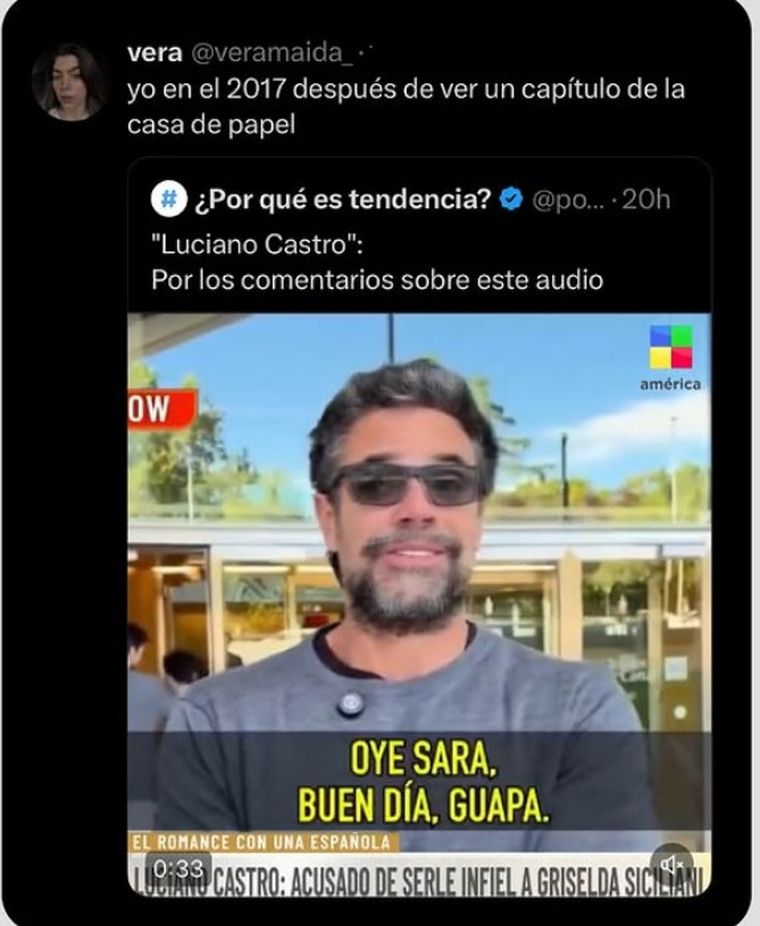 Un audio en tono seductor de Luciano Castro enviado a una camarera desató fue el meme de la semana. El actor grabó el mensaje con un marcado acento español que llamó la atención de inmediato. Ese detalle se volvió el punto de partida para todo tipo de memes en X, Instagram y TikTok.