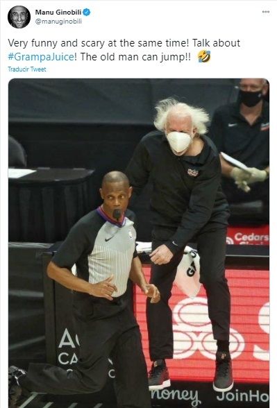 "¡Muy divertido y aterrador al mismo tiempo! ¡Hablen de #GrampaJuice! ¡El viejo puede saltar!", publicó Ginóbili, que puso en el hashtag el apodo que Popovich se ganó en sus últimos años. El Grampa Juice era la pócima mágica que los compañeros decían que Manu tomaba antes de los partidos.