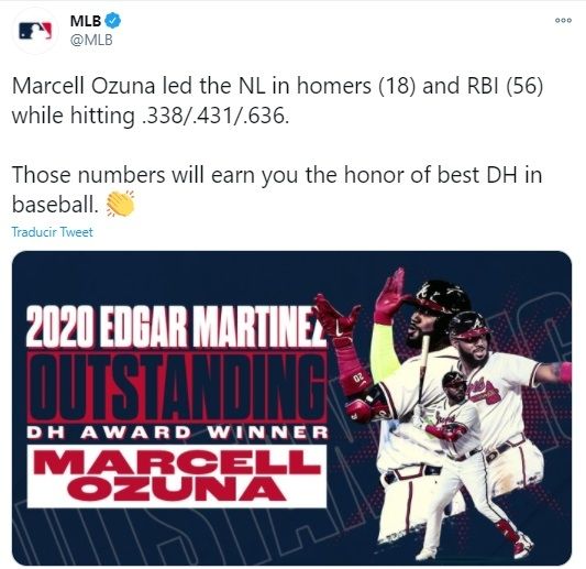 Marcell Ozuna, quien tuvo una de las mejores temporadas ofensivas del año recortado en las Grandes Ligas fue reconocido por con el premio Edgar Martínez, que reconoce al mejor bateador designado de MLB. El dominicano terminó con una línea ofensiva de .338/.431/.636 con 18 jonrones y 80 carreras remolcadas (líder en la Liga Nacional en las dos estadísticas).