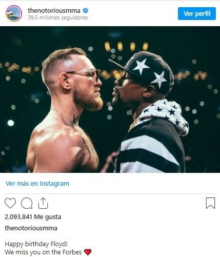 A través de su cuenta oficial de Instagram, McGregor le escribió un mensaje al exboxeador, quien cumplirá años el próximo 24 de febrero. "¡Feliz cumpleaños Floyd! Te extrañamos en Forbes", publicó Conor junto a una imagen de ambos cara a cara. La razón de este mensaje se debe a que Mayweather desde 2018 no aparece en la lista de los 10 atletas mejor pagados del año.
