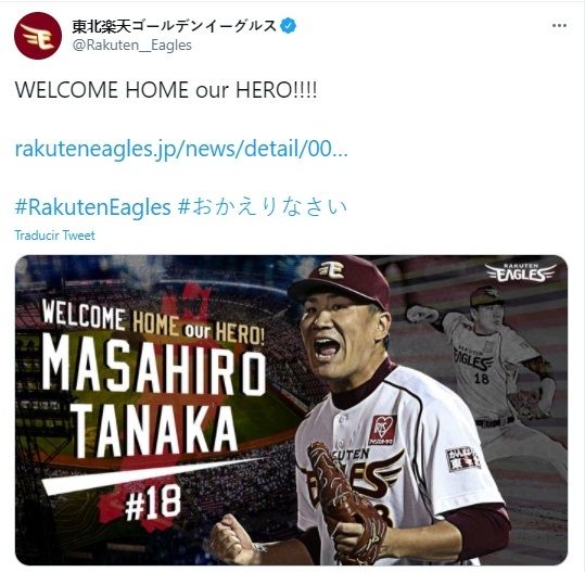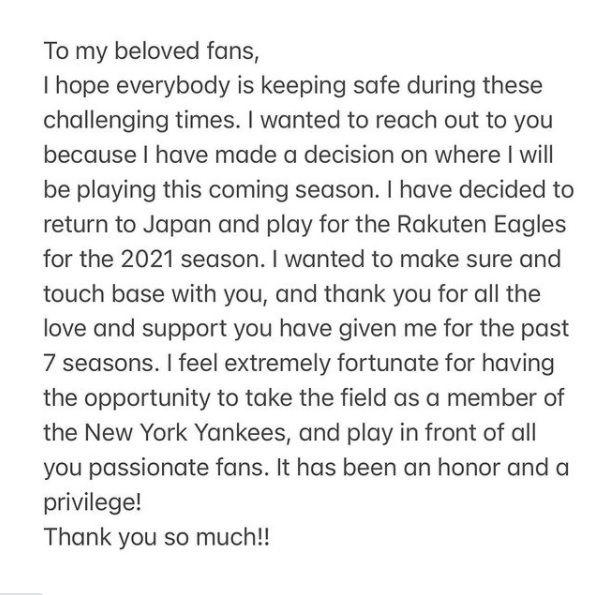 "Espero que todos estén a salvo durante estos tiempos difíciles. Quería ponerme en contacto con ustedes porque tomé una decisión de dónde jugaré esta temporada. He decidido volver a Japón para jugar con los Rakuten Eagles durante la temporada. Quería asegurarme de hablarlo con ustedes y agradecer el cariño y apoyo que me dieron las últimas 7 temporadas", escribió.