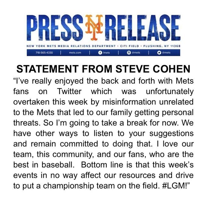 "Realmente disfruté el ir y venir con los fanáticos en Twitter, que desafortunadamente fue superado esta semana por información errónea no relacionada con los Mets que llevó a nuestra familia a recibir amenazas personales", dijo Cohen en un comunicado el sábado después de desactivar su cuenta.