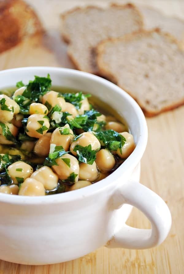 Mezcla el ajo, el perejil y el garbanzo con el aceite de oliva y la sal. Lleva a la heladera y déjalos reposar 20 minutos hasta que el aceite tome el sabor del ajo y listo.
