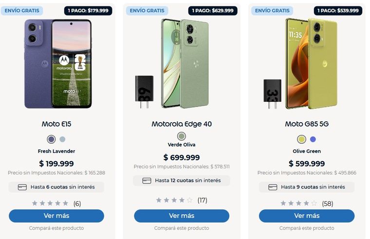 También aparecen opciones como el Moto E15 y el Moto G85. Cada uno cubre distintos usos, desde tareas simples hasta consumo de contenido más exigente.