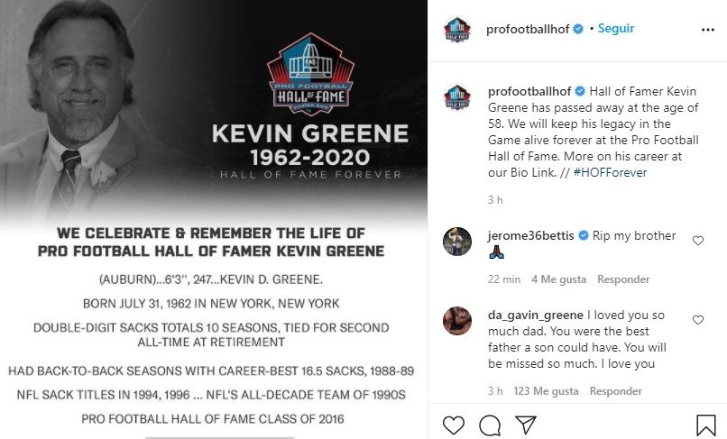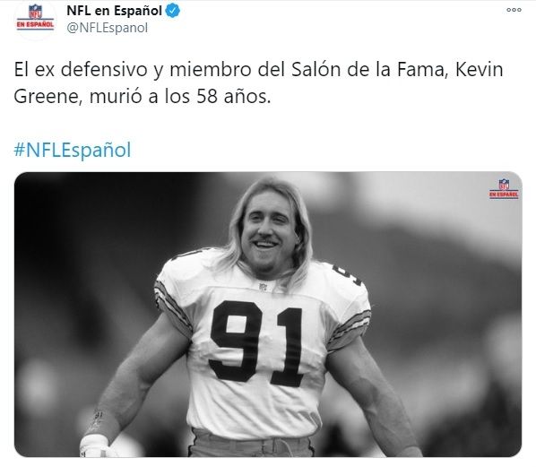 "Toda la familia del Pro Football Hall of Fame lamenta el fallecimiento de Kevin Greene", expresó el presidente y director ejecutivo, David Baker, en un comunicado: "Lo consideraba un amigo personal y un verdadero miembro de nuestra organización en todos los sentidos".