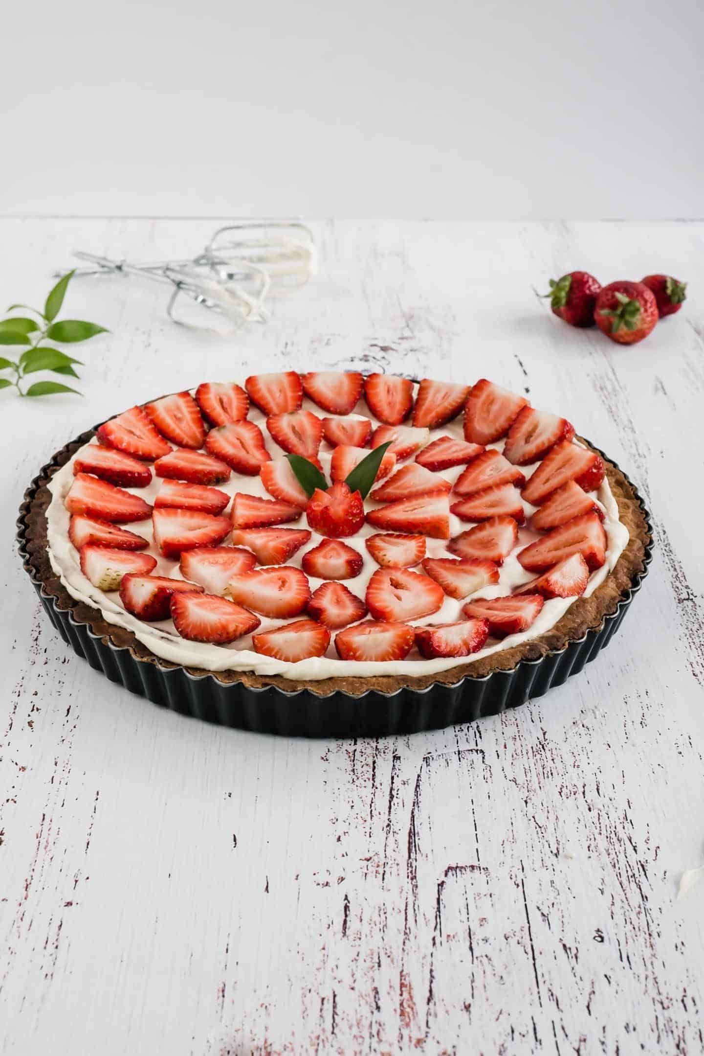 Ponla en el refrigerador por media hora. Mientras tanto, rebana las fresas lo más fino que puedas. Saca la masa, rellénala con dulce de leche y acomoda las fresas encima. Vuelve a dejar el molde en el refrigerador por al menos una hora. Puedes agregar almíbar, miel o gelatina sobre las fresas si lo deseas.