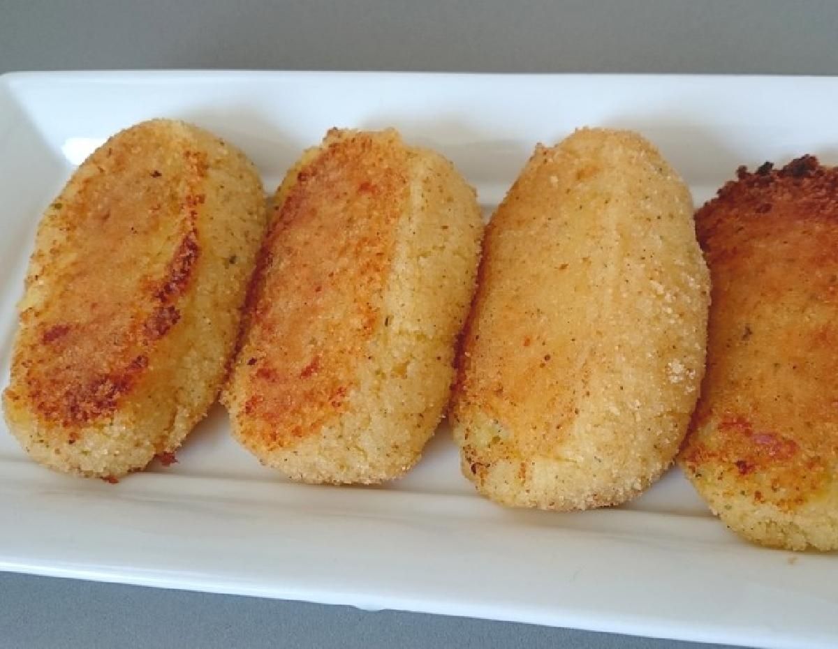 Tomamos una porción con la ayuda de una cuchara y hacemos bolitas del mismo tamaño. Las pasamos por harina, luego por el huevo batido y por último el pan rallado. Colocamos las bombas en una placa y lo dejamos en la nevera por media hora tapado con film.