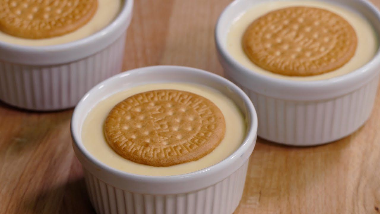 El próximo paso, para evitar que el natilla se corte, es mantener la temperatura de la mezcla por debajo de los 83°C. Dirás: ¡qué sencillo, pero no tengo termómetro! No te preocupes, una vez que la mezcla empiece a espesar, retírala del fuego y reserva. Por último, reparte las natillas en dos cuencos o moldecitos y decóralas con una galleta cada uno. Una vez que se atemperen, las guardarás en el refri hasta el momento de servir. ¡Y listo!