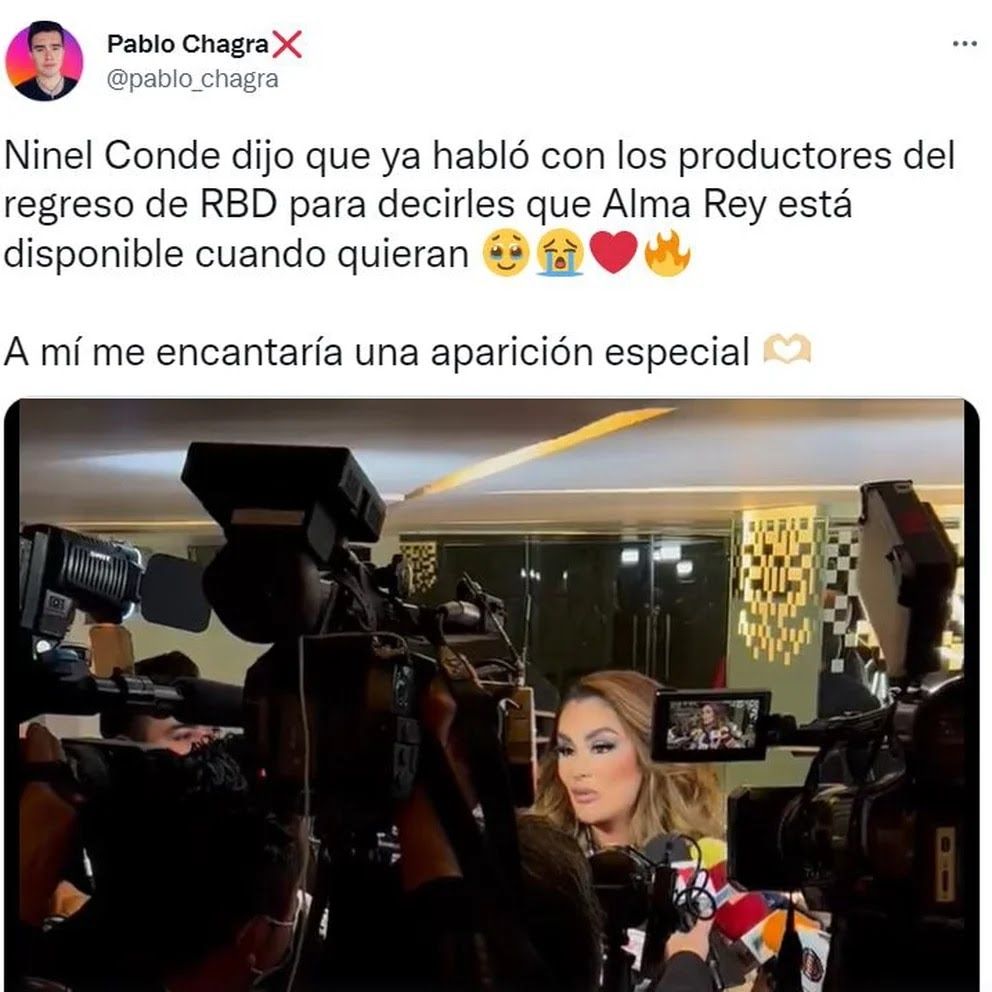 El twitt de Pablo reza: "Ninel Conde dijo ya habló con los productores del regreso se RBD qué Alma Rey está disponible cuándo quieran. A mí me encantaría una aparición especial", notificó el influencer respecto de la posible vuelta.