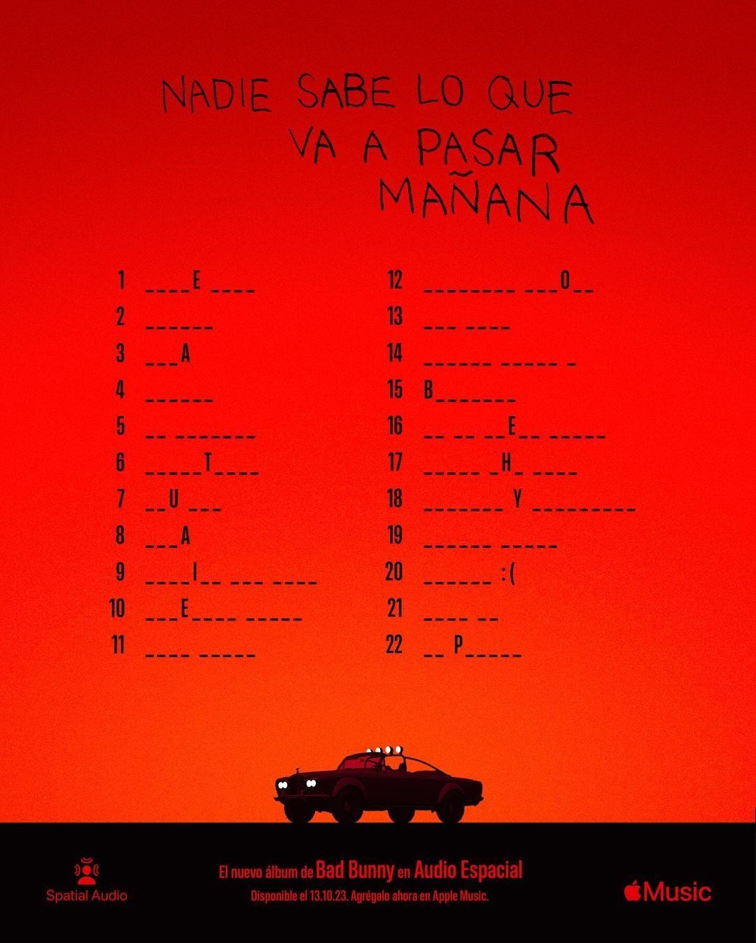 Ayer, Apple Music compartió una imagen con algunos indicios sobre el disco, revelando que cuenta con 22 canciones y algunas colaboraciones sorpresa. Si bien no se conocen más detalles al respecto, Bad Bunny conversó con 'Vanity Fair' y expresó que ha estado "jugando con los sonidos" y se ha inspirado "en la música de la década de los 70", utilizando diversos géneros musicales, ya sea en inglés o en castellano.