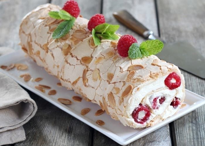 - Colocamos el arrollado de merengue y frambuesas sobre una bandeja, espolvoreamos con azúcar glas. Decoramos y llevamos al refrigerador durante una hora antes de servir.