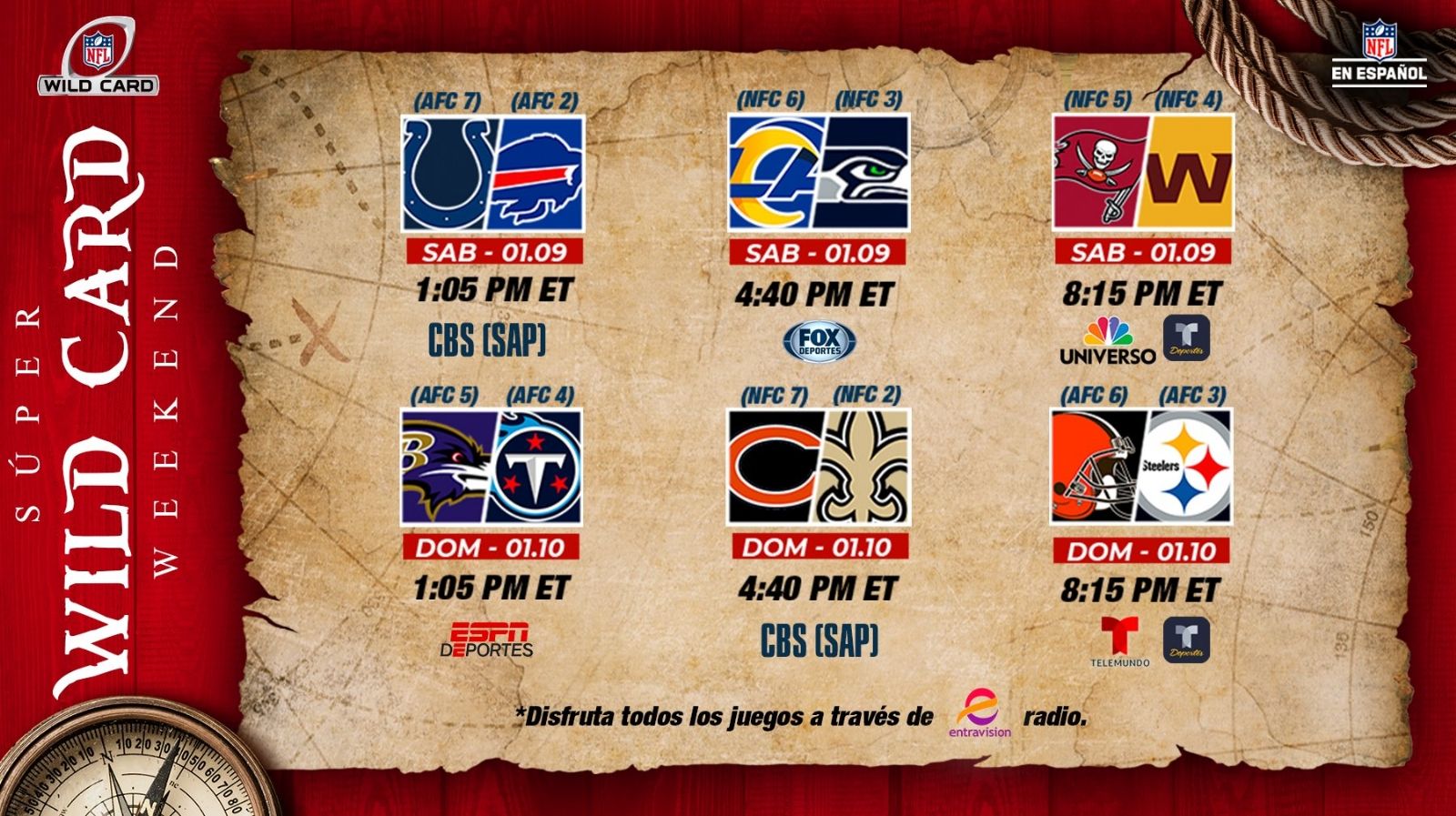 Sí se jugarán el pase otros equipos destacados de la liga en busca de las otras tres plazas restantes para las semifinales de las conferencias Nacional y Americana. La acción empezará con Indianápolis Colts y los Buffalo Bills, seguirán Seattle Seahawks ante Los Ángeles Rams y Washington frente a los Tampa Bay Buccaneers, de Tom Brady, cerrarán la jornada.