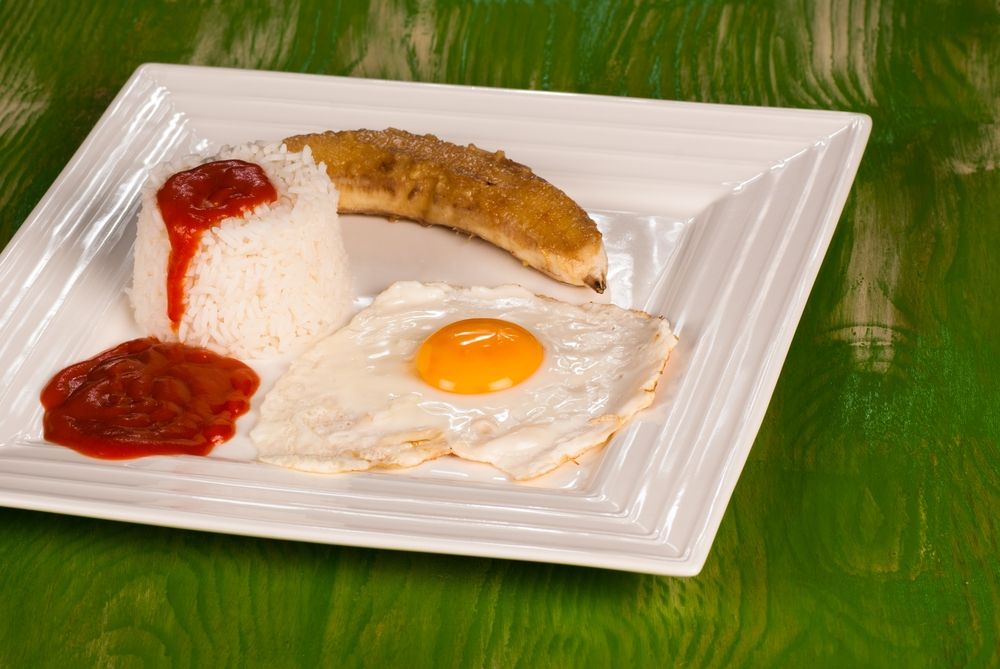 Formar el arroz con una taza o molde, en un plato, agregar un poco de salsa de tomate y colocar los platanos y los huevos fritos al costado.