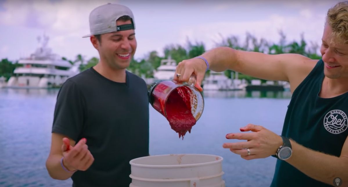 Mark Rober, con la ayuda del biólogo marino Luke Tipple, colocó tres tablas de surf alineadas sobre el mar con distintos líquidos. En la primera colocaron sangre de vaca, la cual reemplazaba a la humana; en la segunda pusieron agua de mar y en la última sangre de peces.