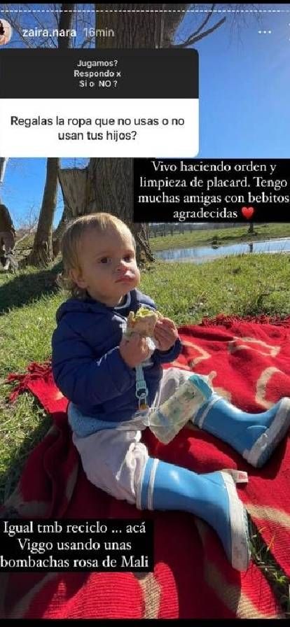 “Vivo haciendo orden y limpieza de placard. Tengo muchas amigas con bebitos agradecidas” e “Igual, también reciclo”. “Por ejemplo, acá está Viggo usando las bombachas rosas de Mali” señaló Zaira junto a una foto de su bebé.