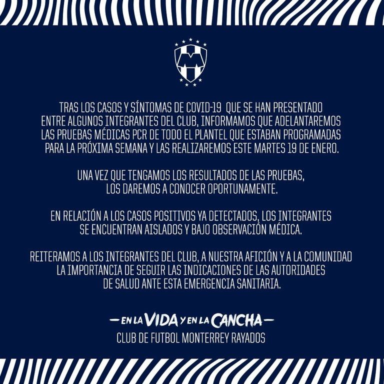 "En relación a los casos positivos ya detectados, los integrantes se encuentras aislados y bajo observación médica. Reiteramos a los integrantes del club, a nuestra afición y a la comunidad la importancia de seguir las indicaciones de las autoridades de salud ante esta emergencia sanitaria”, añadió el Monterrey en un comunicado.