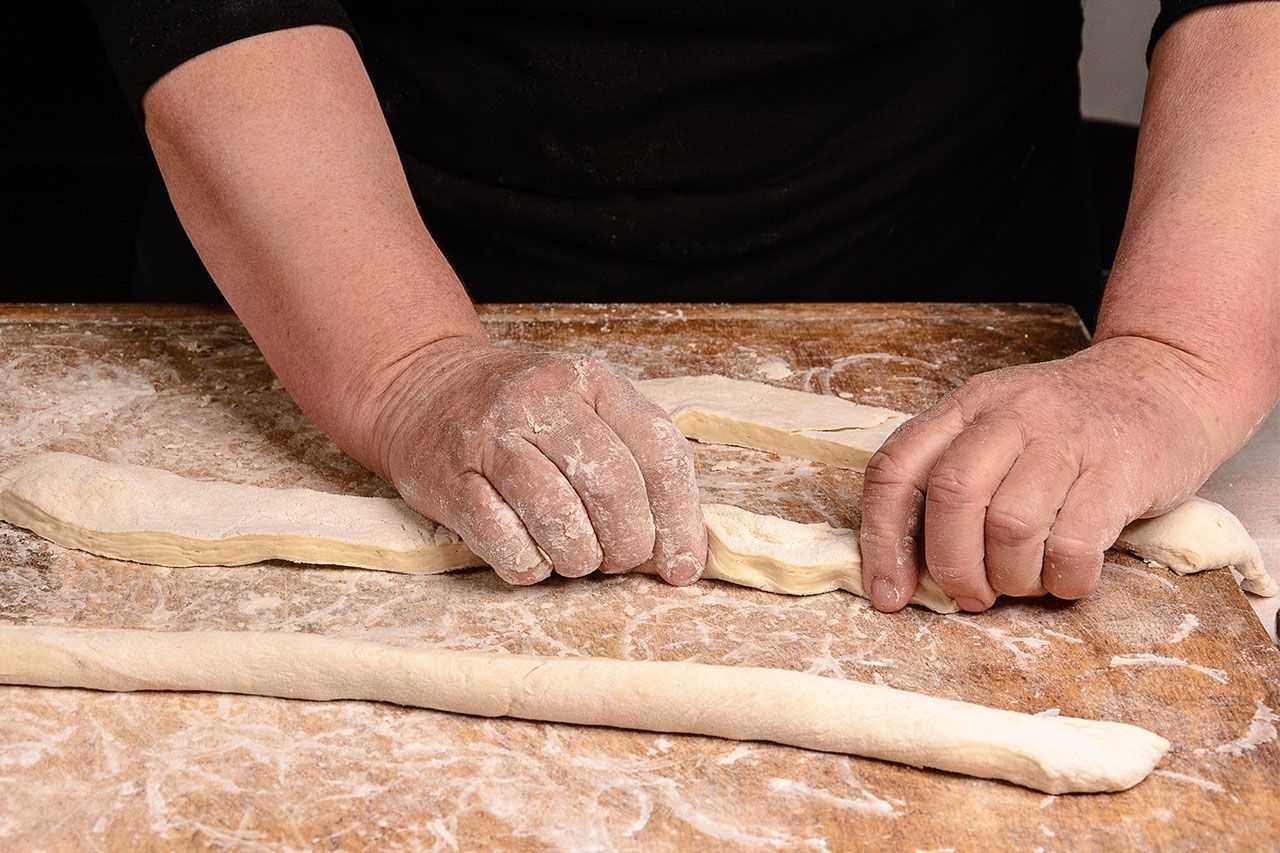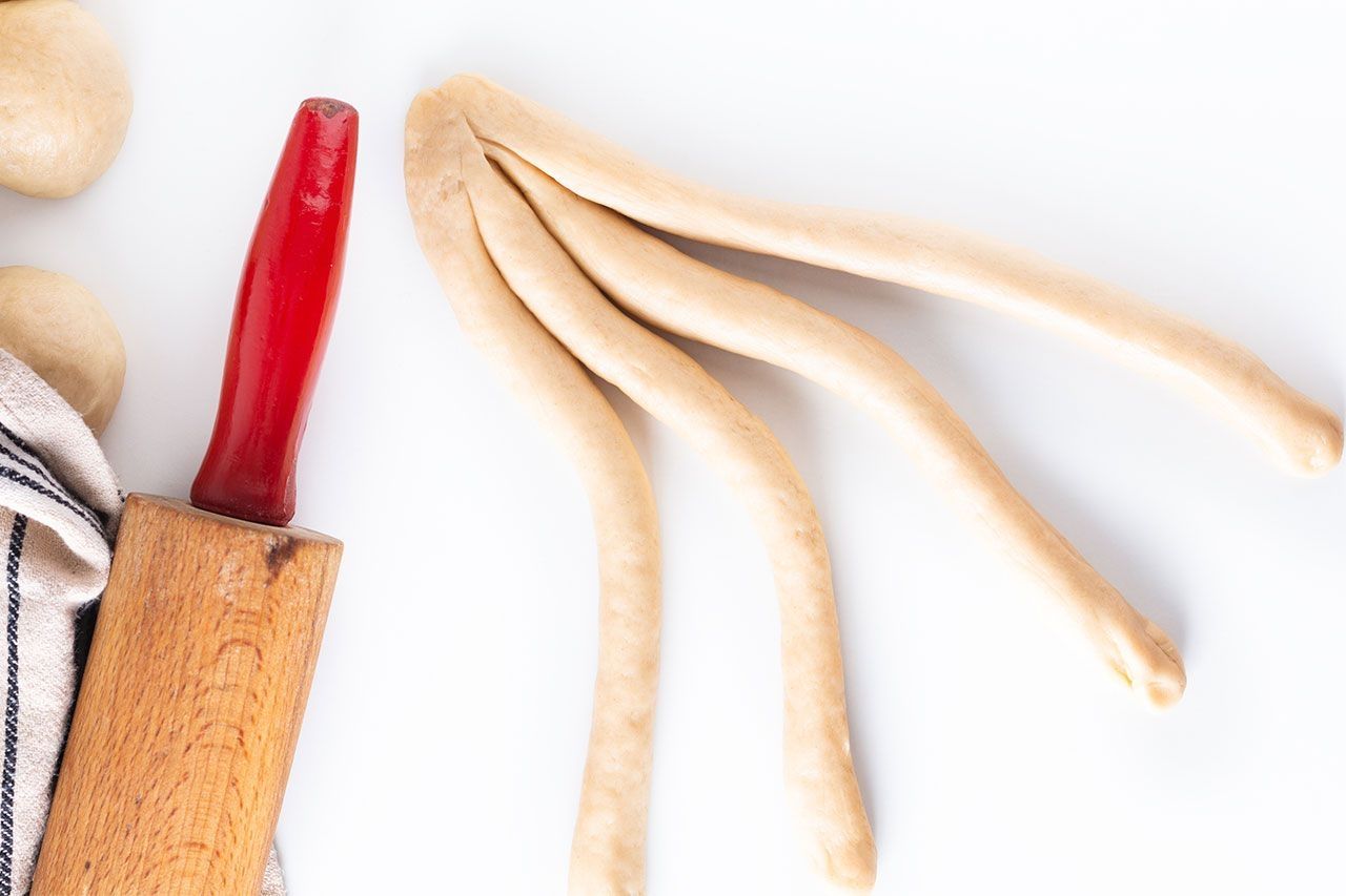 Pasado ese tiempo, debes desgasificar la masa, para eso coloca el bollo sobre una superficie enharinada nuevamente y presiona con la yema de los dedos. Deja reposar 10 minutos tapado con un trapo de algodón limpio y seco y luego divide la masa en 4 partes. A cada una dale una forma alargada con la ayuda de tus manos.