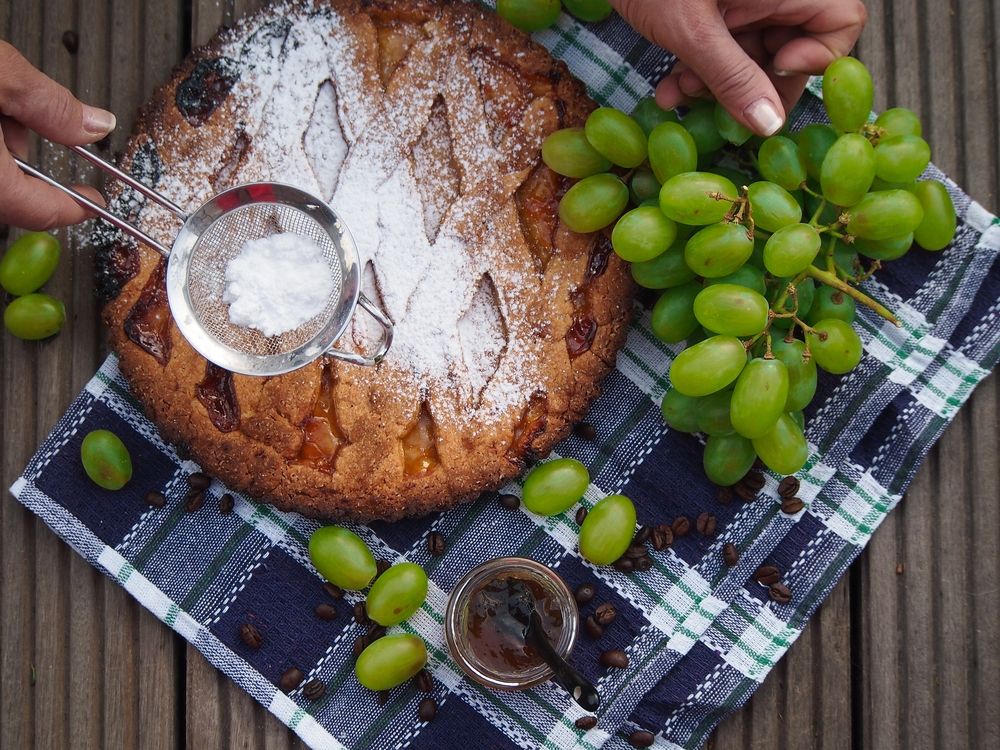 Dejar reposar unos minutos y decora la crostata de mermelada con frutas frescas y azúcar glass.