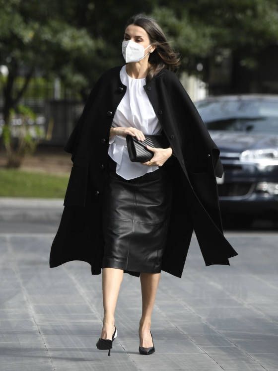 Doña Letizia Ortiz, combinó la Selria de Hugo Boss con una camisa blanca de cuello redondo, con las mangas abullonadas y un gran botón negro de costado. Por encima y para completar el look, la royal lució un tapado Carolina Herrera sobre sus hombros.