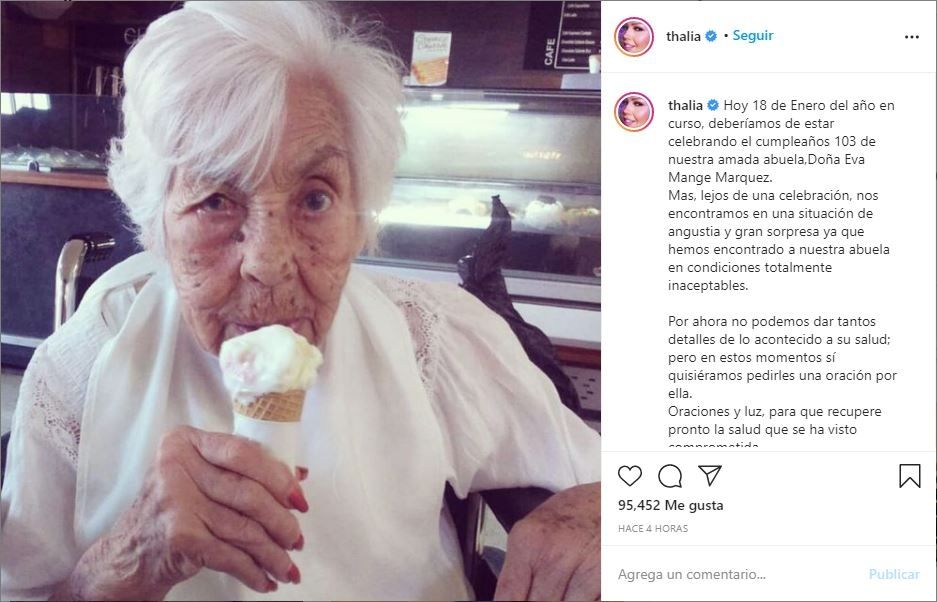Por medio de redes sociales Thalía aseguró sentirse muy angustiada por el estado de salud de su abuela Eva Mange Márquez, quien este lunes cumplió 103 años. "Lejos de una celebración nos encontramos en una situación de angustia y gran sorpresa ya que hemos encontrado a nuestra abuela en condiciones totalmente inaceptables", escribió la cantante en su descargo.