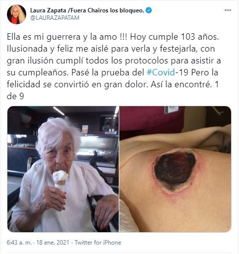 “¡Ella es mi guerrera y la amo! Hoy cumple 103 años. Ilusionada y feliz me aislé para verla y festejarla. Con gran ilusión cumplí todos los protocolos para asistir a su cumpleaños. Pasé la prueba del Covid-19. Pero la felicidad se convirtió en gran dolor. Así la encontré”