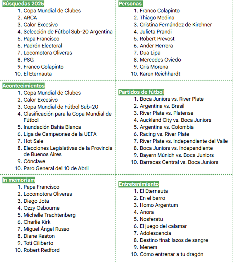 El listado de 2025 combina fútbol de elite, clima extremo, elecciones, paros, figuras del espectáculo y series que se volvieron conversación obligada. Una mezcla muy argentina, donde la pasión convive con la crisis y la nostalgia.