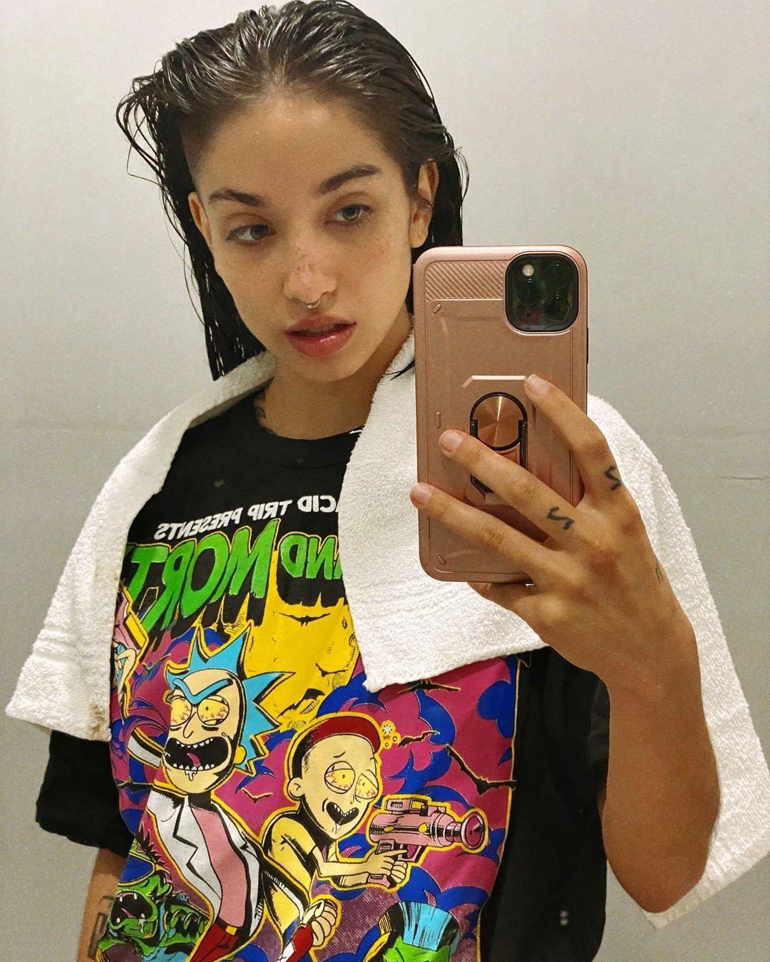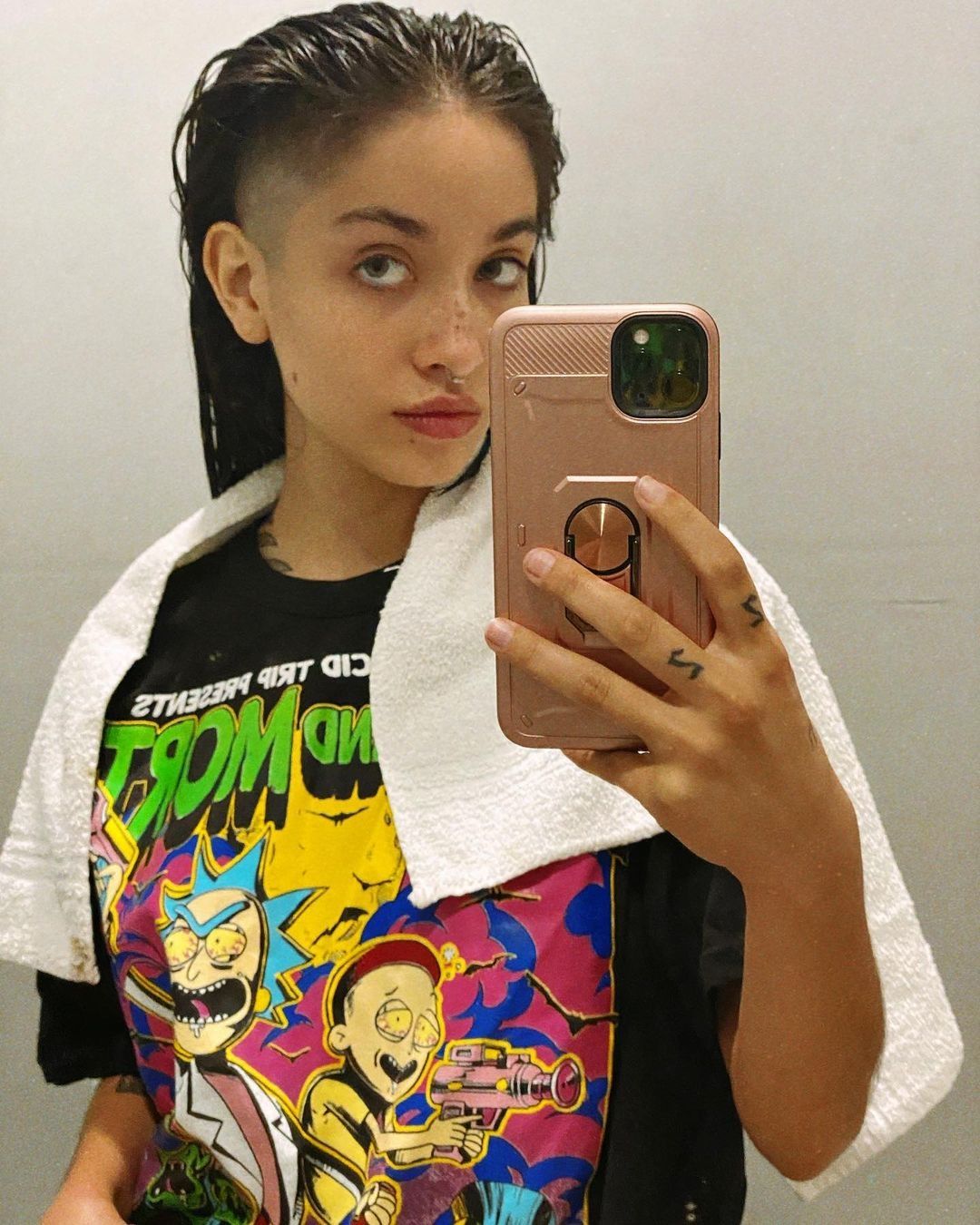 En las imágenes que subió a su cuenta de Instagram podemos ver a Becerra recién salida de la ducha vestida con un remerón de Rick & Morty y con el cabello mojado luciendo su nuevo look frente al espejo.