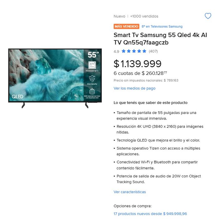 En un nivel superior aparece el Samsung Q7F QLED. Este modelo suma tecnología avanzada de color y mejor procesamiento de imagen. Los detalles se ven más definidos y el movimiento es más suave. Es una elección pensada para quienes buscan mayor calidad.