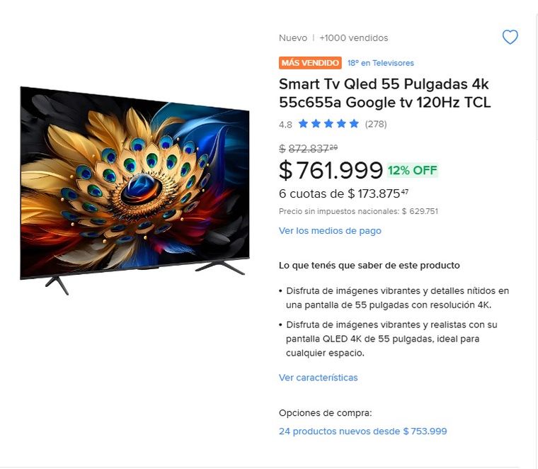 La opción más buscada es el modelo TCL V6C-F de 55 pulgadas. Su precio ronda los 700 mil pesos en tiendas como Mercado Libre. Ofrece resolución 4K, HDR y sistema Google TV. Es una de las mejores elecciones por su relación entre costo y calidad.