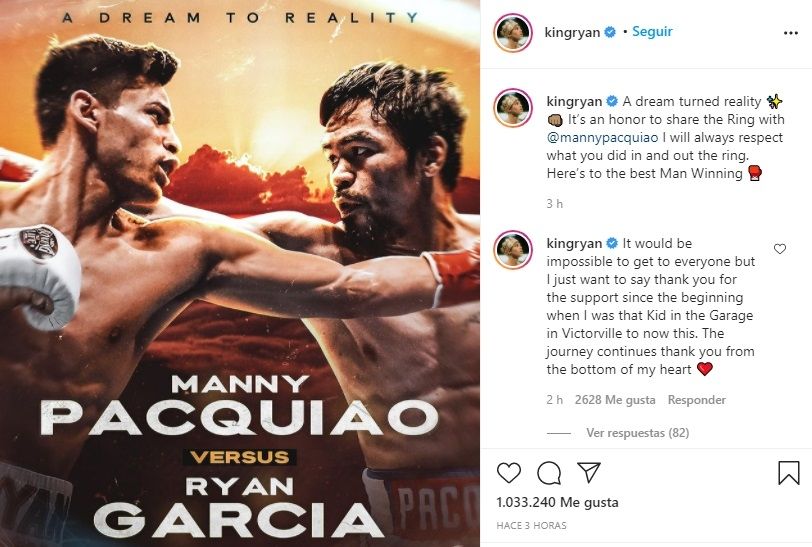 "Un sueño hecho realidad. Es un honor compartir el ring con Manny Pacquiao. Siempre respetaré lo que hiciste dentro y fuera del cuadrilátero. Espero que gane el mejor", fue el mensaje con el que acompañó la imagen promocional. Todavía no se define la fecha, sede y el peso en que se enfrentarán.
