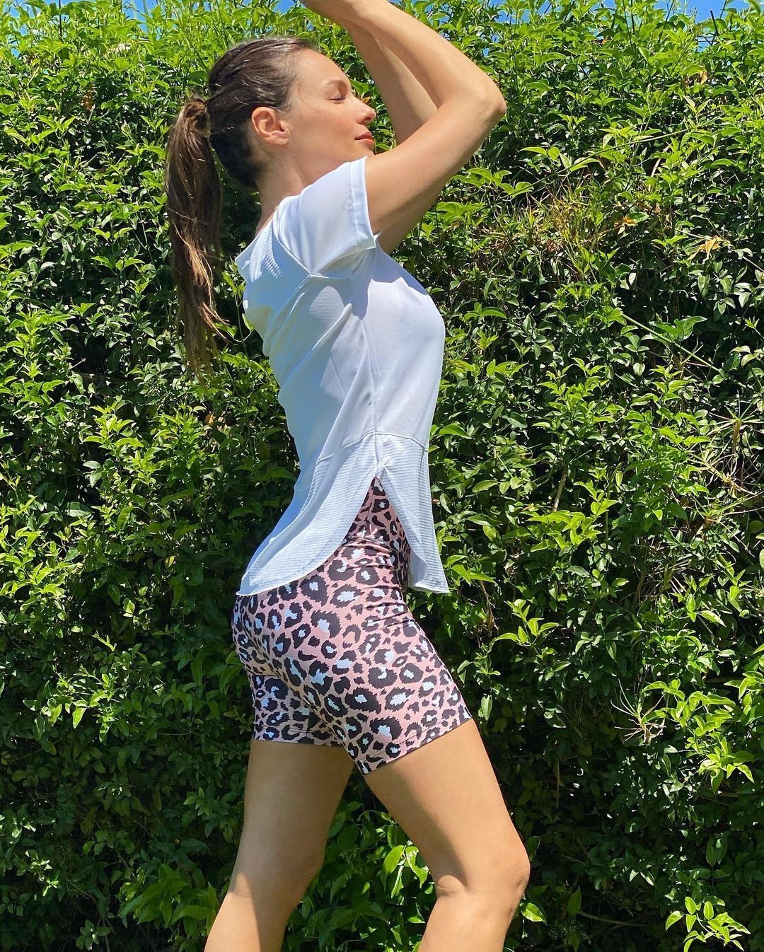 En estas recientes pics de Pampita se la puede observar con una espléndida sonrisa luciendo una calza estampada animal print y una remera blanca.