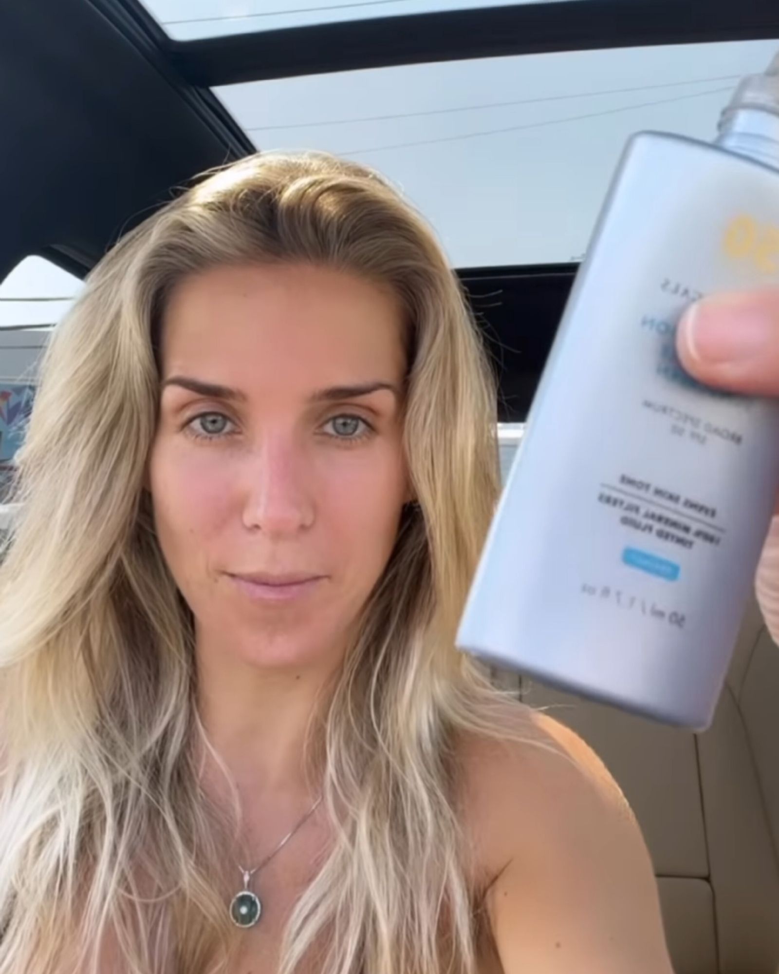 "Me pongo protector solar que ya a la mañana me puso, me levanté siete de la mañana para llevar a Milo al cole y me estaban quedando muchas marcas por el sol y me habían salido granitos y después con el sol se me manchó la piel asi que lo primero que hago es ponerme protector solar", continuó diciendo mientras que se masajeaba el rostro con la crema protectora y que a su vez trabaja como un autobronceante.
