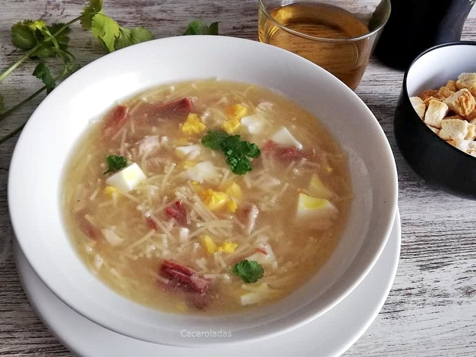 500 gramos de pollo con las carcasas, 2 huevos, 2 zanahorias, 1 hueso en salazón, 1 puerro, 100 gramos de jamón serrano, 120 gramos de fideos para sopa o arroz, hojas frescas de hierbabuena opcionales para decorar.