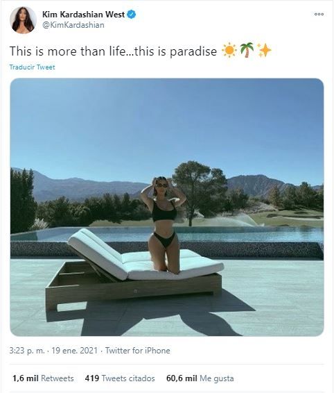 "This is more than life... this is paradise" ("Esto es más grande que la vida... esto es el paraíso"), escribió en su publicación tanto en Twitter como en Instagram Kim Kardashian. En medio de la conmoción tras lo sucedido en el Capitolio de Estados Unidos, y teniendo en cuenta la escandalosa cantidad de muertes que superan los 400 mil fallecidos a causa del covid-19; era de esperarse que le llovieran las críticas.