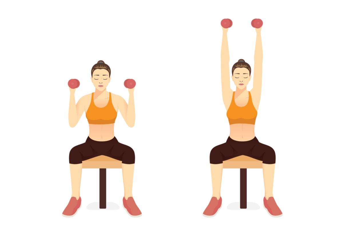 4. Para el siguiente ejercicio necesitarás de una silla o plataforma. Coloca tus manos sobre ella, mientras tus piernas hacen un ángulo de 90°. Dobla los codos y luego vuelve a la posición inicial.