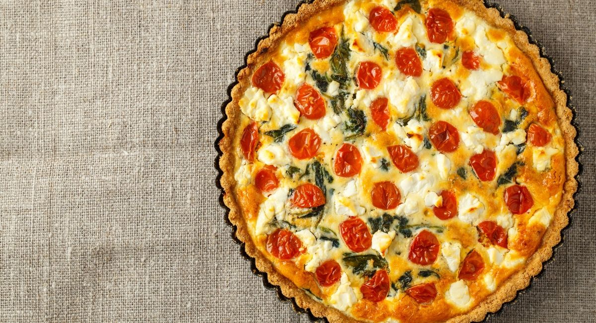 Estiramos la masa, le damos cocción por 5 minutos, colocamos un papel aluminio y unas legumbres para que haga peso. Posteriormente, mezclamos los huevos con la salsa y los vegetales, vertemos la mezcla sobre la masa y decoramos con el tomate. Cocinamos por 20 minutos ¡y listo!