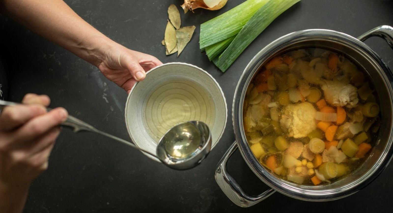 Como siempre decimos, la cocina es un arte y tu platillo es el protagonista. Pasado el tiempo de cocción, retira las carnes, el hueso y las verduras. Deja que el consomé se enfríe así, con la ayuda de una cuchara, retiras la grasa que se endurece en la superficie. Tip MDZ: si quieres que el consomé quede más espeso, ponlo de nuevo al fuego y espera que se reduzca a la mitad o un poco más, eso depende de tu gusto.