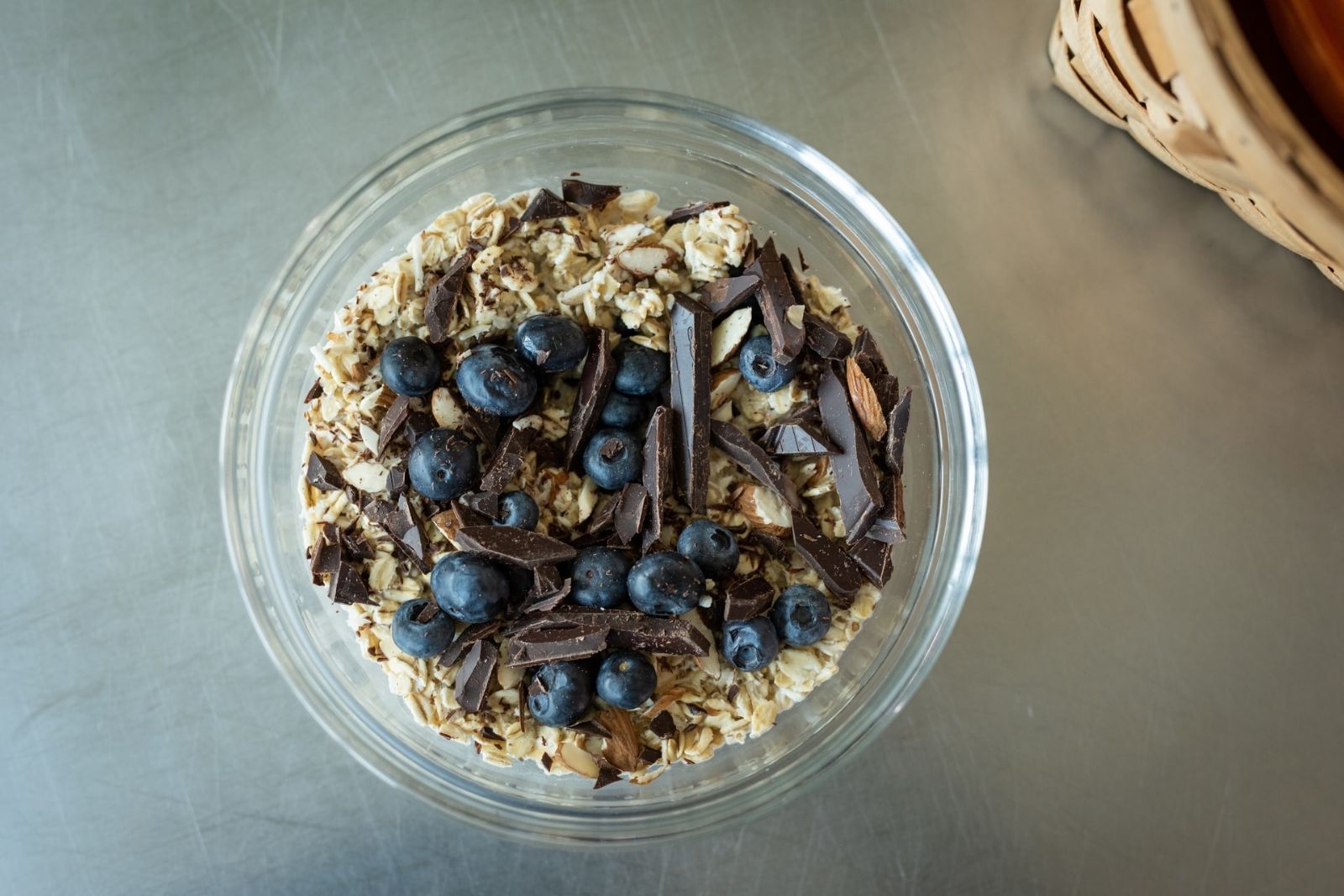 Sobre la base de avena colocamos el cacao amargo y mezclamos hasta integrar. Decoramos por encima con los arándanos y las nueces troceadas.