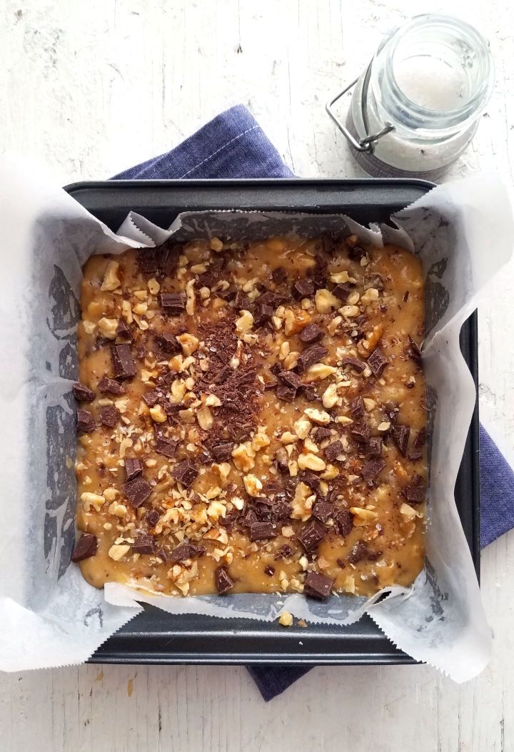 Agregamos la harina y la sal, mezclar sólo lo necesario para integrar. Agregar media taza del chocolate troceado, nueces y mezclar. Verter la mezcla en el molde, agregar el resto del chocolate y nueces en el tope, si deseas, puedes chocolate fundido.