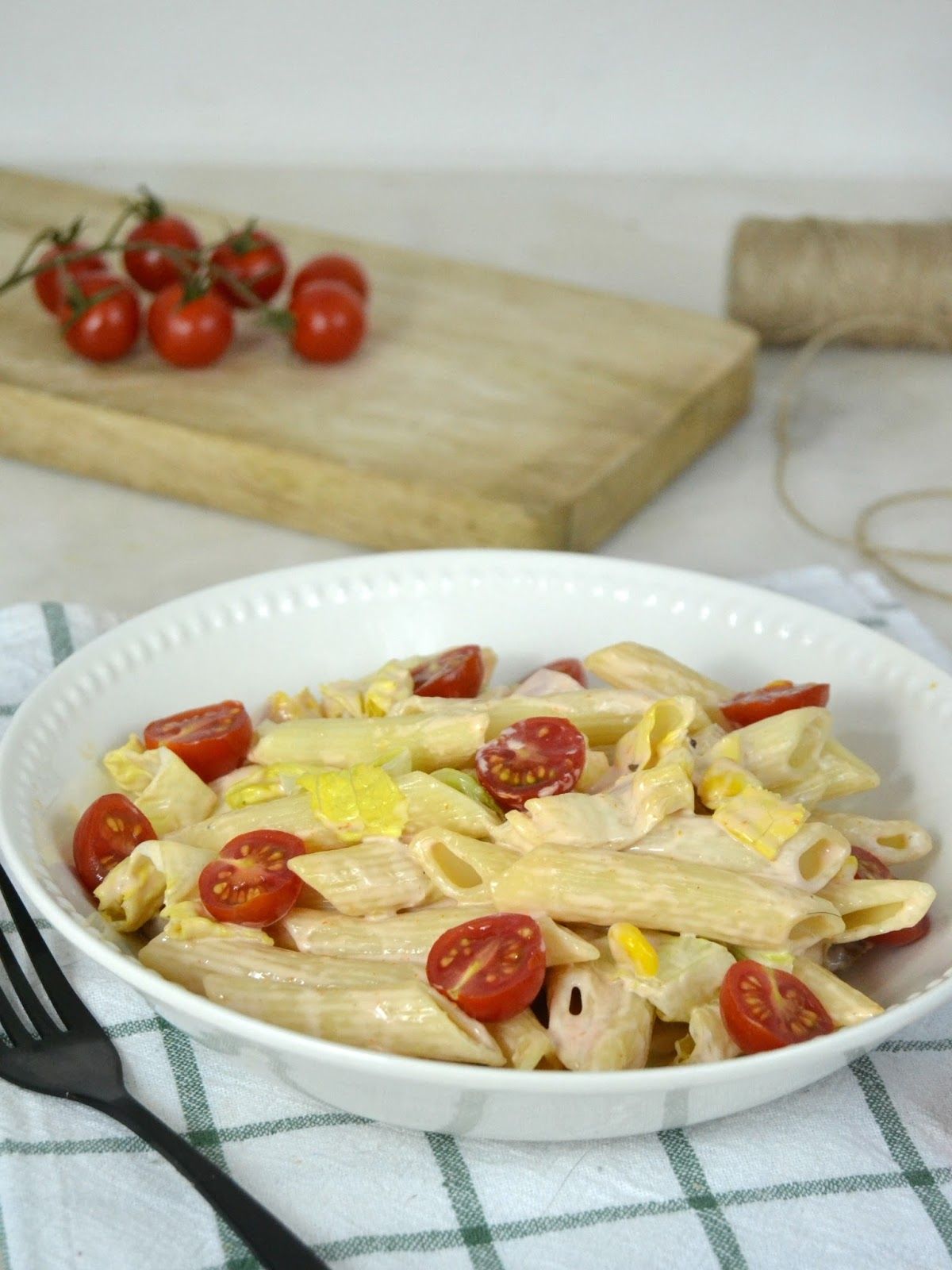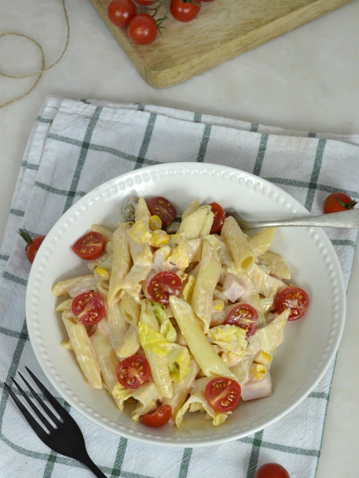 - Cortamos el jamón en dados, escurrimos el maíz o si tenemos que cocinarlo lo lavamos, cocinamos y desgranamos. Agregamos los condimentos y los tomates cherry ¡y lista nuestra ensalada de pasta!