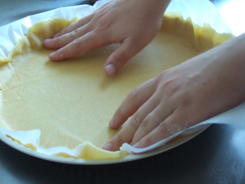Pasado este tiempo, la sacamos de la heladera, amasamos por un minuto y la estiramos con el palo de amasar, debe quedar de unos 3 milímetros de espesor. Enmantecamos y enharinamos el molde, colocamos la masa que cubra todos los bordes y pinchamos con el tenedor la base. Con estas cantidades podemos hacer una tarta de 20 centímetros aproximadamente.