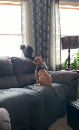 En las imágenes se puede ver cómo Jasper, el minino, se acomoda arriba del sillón para observar la calle. Su compañero canino, un beagle de cinco meses llamado Bo decide acompañarlo y se sienta al lado de él. Inmediatamente posa una de sus patas delanteras por encima del animal para "abrazarlo".