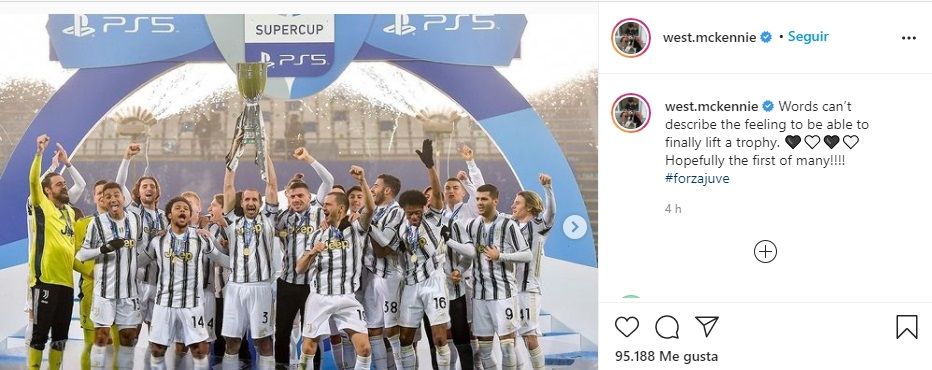 "Las palabras no pueden describir la sensación de poder finalmente levantar un trofeo. ¡Esperemos que el primero de muchos!", escribió el seleccionado del combinado de las Barras y las Estrellas. Esta consagración quedará registrada como el primer título que McKennie en su carrera, pues el joven de 22 años se quedó con las manos vacías durante su paso por el fútbol alemán.