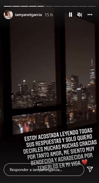 Por último, Yanet compartió un video de la noche neoyorquina desde su lujoso departamento. “Estoy acostada leyendo todas sus respuestas y solo quiero decirles muchas muchas gracias por tanto amor, me siento muy bendecida y agradecida por tenerlos en mi vida” fue el positivo texto que escogió la ex chica del clima de la señal Televisa para acompañar su grabación en su storie.