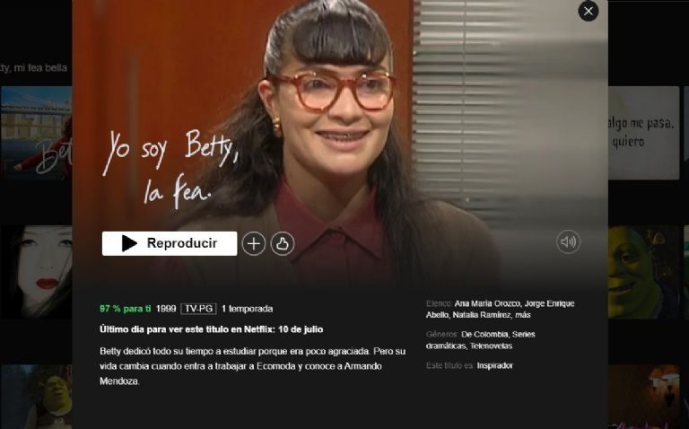 Yo soy Betty, la fea supo mantenerse dentro del Top 10 de series de habla inglesa más vistas a lo largo de 25 semanas, con más de 9.4 millones de horas visualizadas. A pesar de su evidente éxito, desde Netflix aseguraron que la telenovela se despide de su catálogo el próximo domingo 10 de julio, según el anuncio que se puede ver debajo de la descripción de la serie. Al enterarse, los fanáticos se mostraron tristes en redes sociales, por desconocer a qué otra plataforma tendrán que migrar para seguir el rumbo de este clásico.