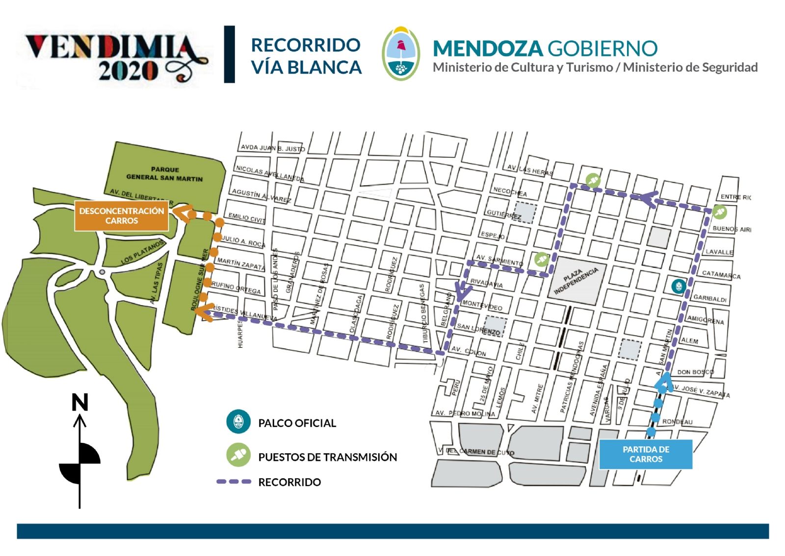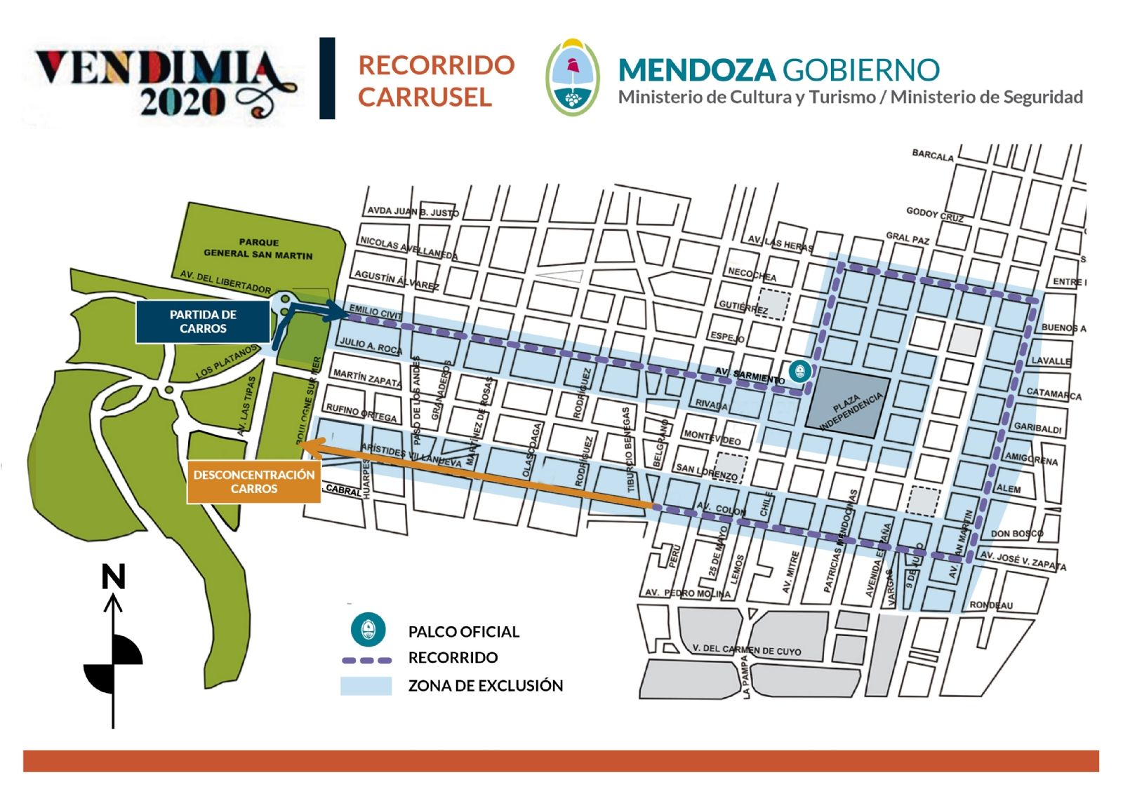 Desde las 17, se cortarán las siguientes calles: avenida San Martín desde Peltier a avenida Las Heras, luego hasta Chile, Chile desde Las Heras hasta Espejo, desde Espejo hasta Sarmiento, desde Sarmiento hasta Belgrano, Belgrano hasta Colón y finalizando en Boulogne Sur Mer. El palco oficial se ubicará frente al Ente Mendoza Turismo (Emetur), sobre la vereda del Pasaje San Martín.