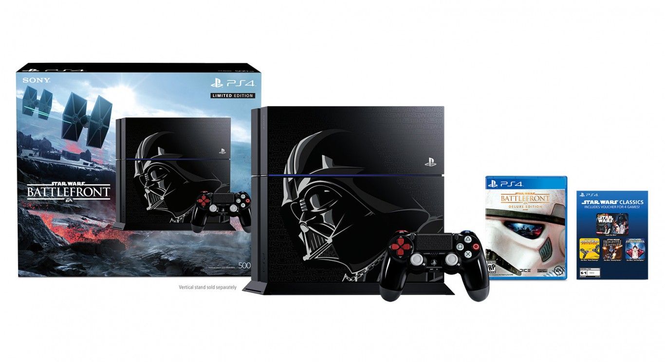 Finalmente, el 17 de noviembre se lanzarán dos packs de Star Wars Battlefront, ambos incluyendo el sistema de 500 GB. La edición limitada costará 400 dólares, mientras que la estándar podrá ser adquirida al nuevo precio de 350.